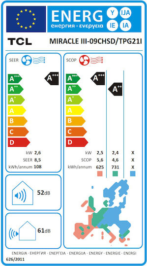 Το κλιματιστικό ανήκει στην ενεργειακή κλάση A+++, στην ψύξη και στην ενεργειακή κλάση A++ στη θέρμανση (μέση ζώνη). Η ενεργειακή κλάση μετριέται σε μια χρωματική κλίμακα επτά βαθμίδων από Α+++ έως D, με την κλάση Α+++ να είναι η αποδοτικότερη, ενώ αντίθετα η κλάση D, η ελάχιστα αποδοτική.